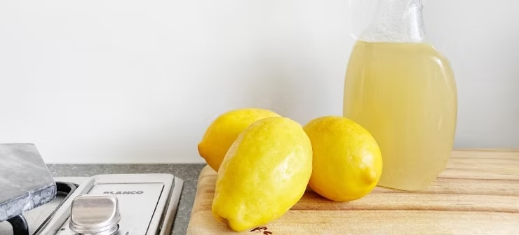 Eco-friendly cleaning products with natural ingredients, spray bottles, lemons, and a plant on a countertop